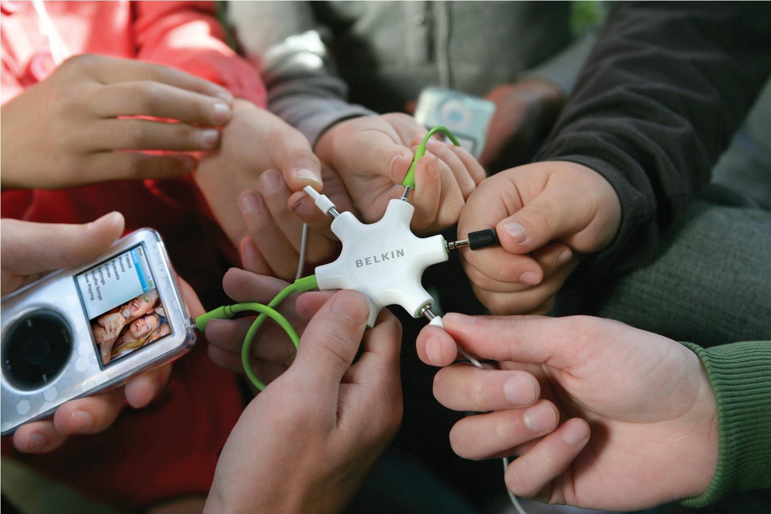 “The Belkin RockStar 5-Way 3.5-mm Headphone Splitter features a five jacks for attaching headphones or iPod devices, one hard-wired connection for your MP3 player, mixing and fade-ins, Works with all MP3 and portable DVD players.”