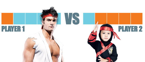 Various letters: KO, VS, PLAYER 1, PLAYER 2, INSERT COIN, AAA, HIM, HER