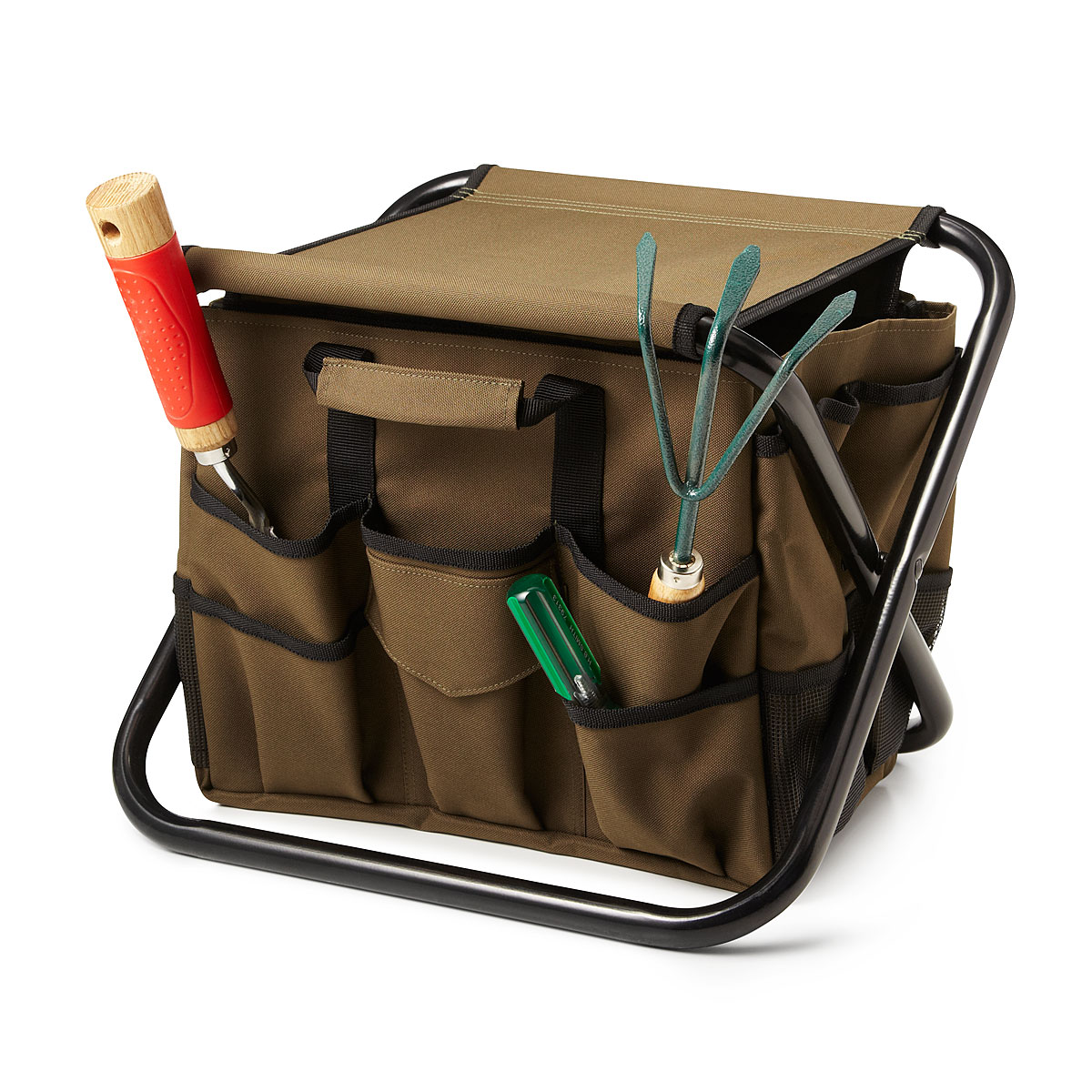 “Keep the dirt off your knees and your tools close by with this multi-function gardener’s seat. Combining the features of a tool bag and a folding chair, this handy seat is made of lightweight steel and water-resistant nylon. The bag detaches easily from the frame via hook-and-loop fasteners and has two carrying handles, 21 pockets for different sized tools and a large catch-all interior.”