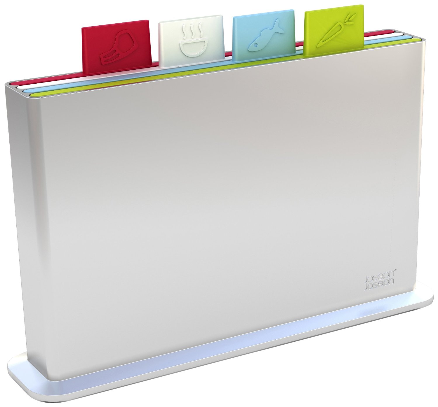 “Joseph Joseph’s Index chopping boards makes food safety in the kitchen a snap. The cutting board’s categorization system offers 4 color coded boards to distinguish at a glance which board is intended for which use: red for raw meat, blue for seafood, green for veggies and white for cooked foods. For further ease, the boards also have an illustrated tab indicating their use. The 4 boards store in staggered order making the right board readily accessible and are contained in a neat ABS storage case that has a non-slip base. Each board is made from dishwasher safe polypropylene.”