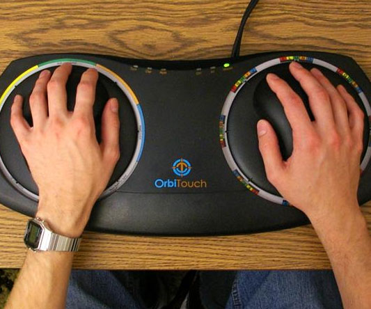 “For many people, a simple computer keyboard is like a wall that is impossible to climb. Having no access to a computer isolates people and limits their ability to communicate with loved ones, surf the web, and tap into a world of information. The orbiTouch allows typists to type all keys found on a keyboard, plus provides a fully-integrated mouse capability — all via two ergonomically sculpted domes. The alphabetic and color rings provide immediate out-of-the-box use. Typists are able to type by simply sliding to a color on the left dome and a character group and on the right dome. A complete software learning program is provided with the orbiTouch that quickly allows anyone new to the orbiTouch a way to gain speed and proficiency.”