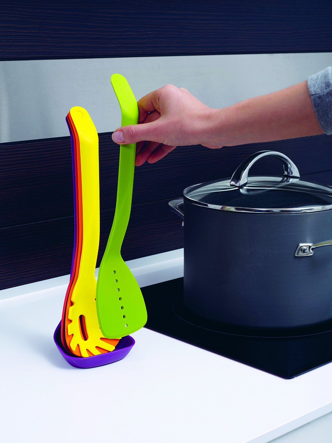 “Nest is the ultimate collection of practical, space-saving kitchenware comprising a unique range of food preparation sets. Their innovative design allows the individual elements within each set to be stacked perfectly together, thereby occupying the absolute minimum amount of space, wherever they are stored. Nest Utensils are the latest addition to the range, comprising five essential kitchen tools in a compact, self-supporting design, which not only looks great in the kitchen but eliminates the need for an additional utensil pot. The set contains a slotted spatula, spaghetti server, slotted spoon, solid spoon and a ladle. When nested the tools are held securely in place by small magnets in the handles.”