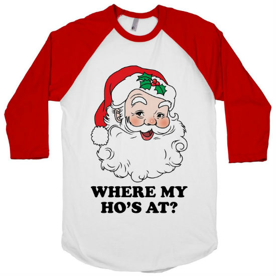 “If Santa is known for one thing, it’s his big, powerful, booming ho’s! Perfect for wearing this holiday season! This funny holiday shirt will bring joy to passers-by and laughs to your friends and family! Everyone knows that Santa’s a huge pervert. All he talks about is his huge sack, naughty girls, and ho ho hos!”